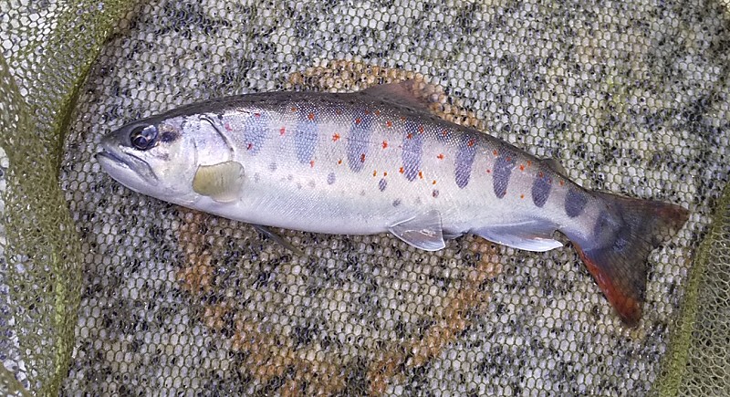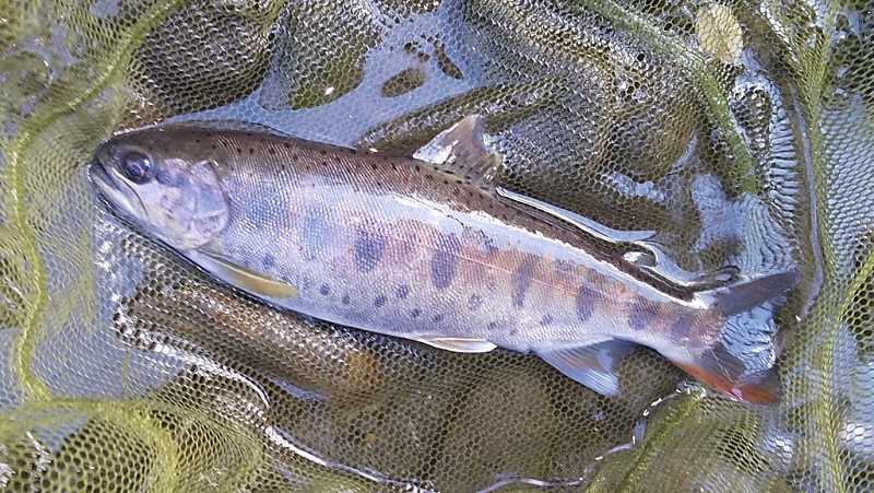 持参したオニギリとカップラーメンで早昼を済ませ、午後は最後の毛鉤に望みを託しどうにか2尾のアマゴを釣ることが出来た。1尾はボテボテに太った24cm