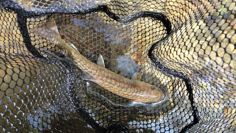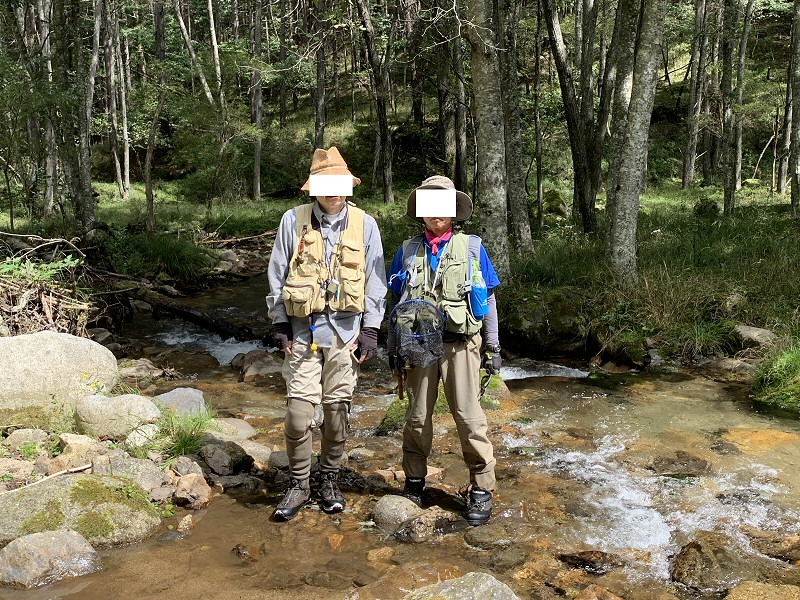 そそくさと朝食を済ませ3人で釣り場へ直行。遡行予定区間の半分程で2匹のちびイワナにお目にかかれたが、先行した同僚の情報から残り半分の区間は倒木が酷く遡行困難と言うことで予定通り正午をもって釣行は終了とした。