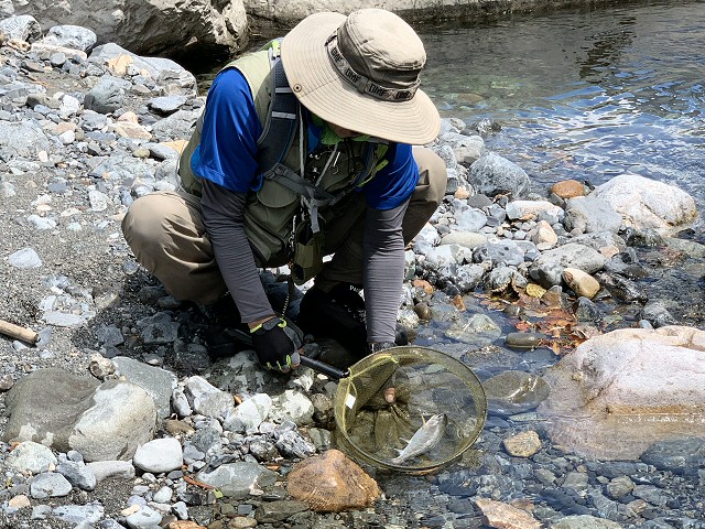 渇水のためかポイントが絞りやすくなかなか釣果が上がらない。瀬脇の石裏を中心に丁寧に毛鉤を打込んだら、思わぬ大物や綺麗な魚体に出会えた。