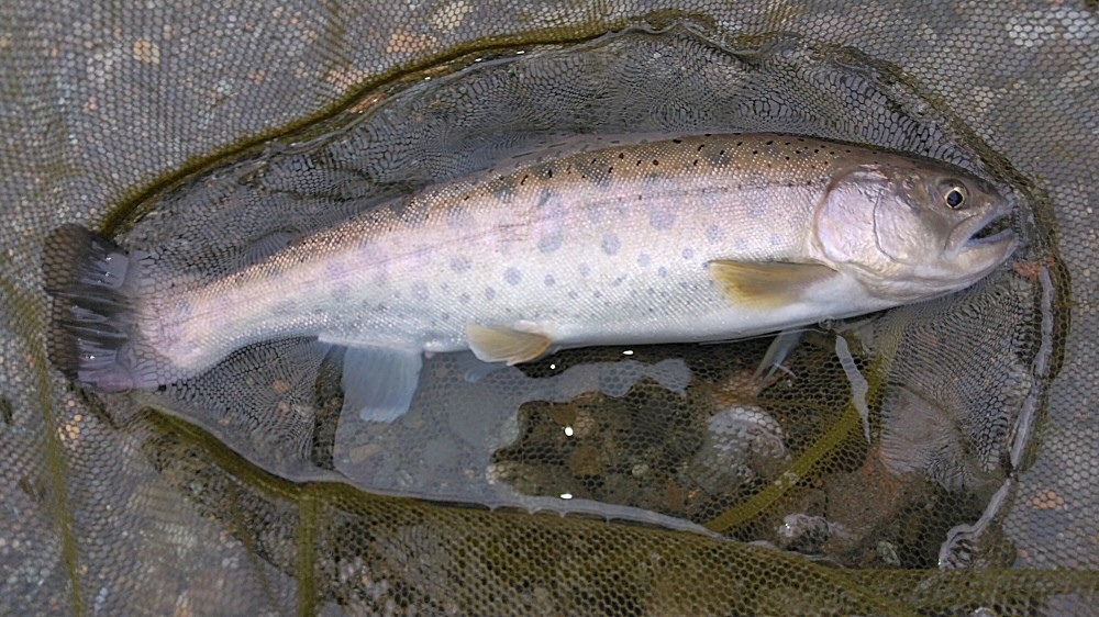 早々に中流域へ移動したが上流の堰堤で取水の為かなりの渇水状態。先行者が叩いたであろうポイントは極力外し、流れのぶつかりを中心に毛鉤を流した。効果てき面、